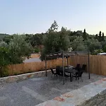 Ze všech pokojů apartmánu Almyrolithos je výhled na zahradu. K dispozici jsou také bidet a sprcha.